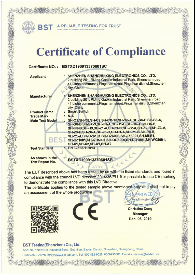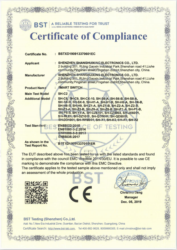 尚慧興六年以來主要從事觸摸屏智能控制系統研發和生產,其中包括了觸摸屏智能燈控開關、輕觸智能開關、觸摸屏智能溫控開關以及酒店類電子門牌和觸摸屏智能門鈴、取電開關紅外/門磁感應開關等等產品的研發和生產。并成功研發出適用于現代建筑理念與風格的智能控制產品,為酒店、辦公大廈、家居、別墅等不同類型的用戶提供專業的智能控制方案。同時與國內多家智能家居公司提供智能開關研發及生產加工。目前已經與無線通訊433單向、433雙向、Zigbee 、Z-wave 及2.4G等成功對接。尚慧興在自主研發的基礎上采用了符合歐洲高標準、高環保、高節能、高能效要求的尖端技術。經過大量的技術實驗與市場驗證,現已形成了一系列先進、成熟并擁有自主核心技術的觸摸屏智能控制產品。同時,我們的產品均符合3C認證、CE認證和FCC認證等標準。尚慧興擁有一批專業的研發設計、品質控制、技術支持、服務管理隊伍,公司通過并全面貫徹實行ISO9001:2015國際質量體系標準,從原材料的購買到篩選、生產、包裝及裝運,每一個環節都進行嚴格的檢測,以保證每一出廠的產品合格。