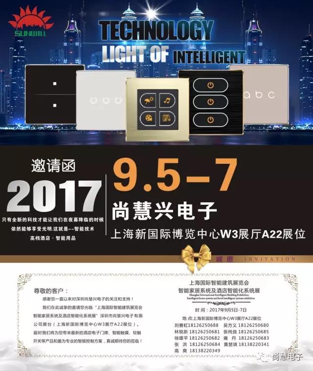 深圳市尚慧興電子有限公司展臺(上海新國際博覽中心W3展廳A22展位),本次展會我們將為您帶來新的定制電子門牌、智能觸摸開關、輕觸開關等產品和專業的智能控制方案,真誠期待您的蒞臨!