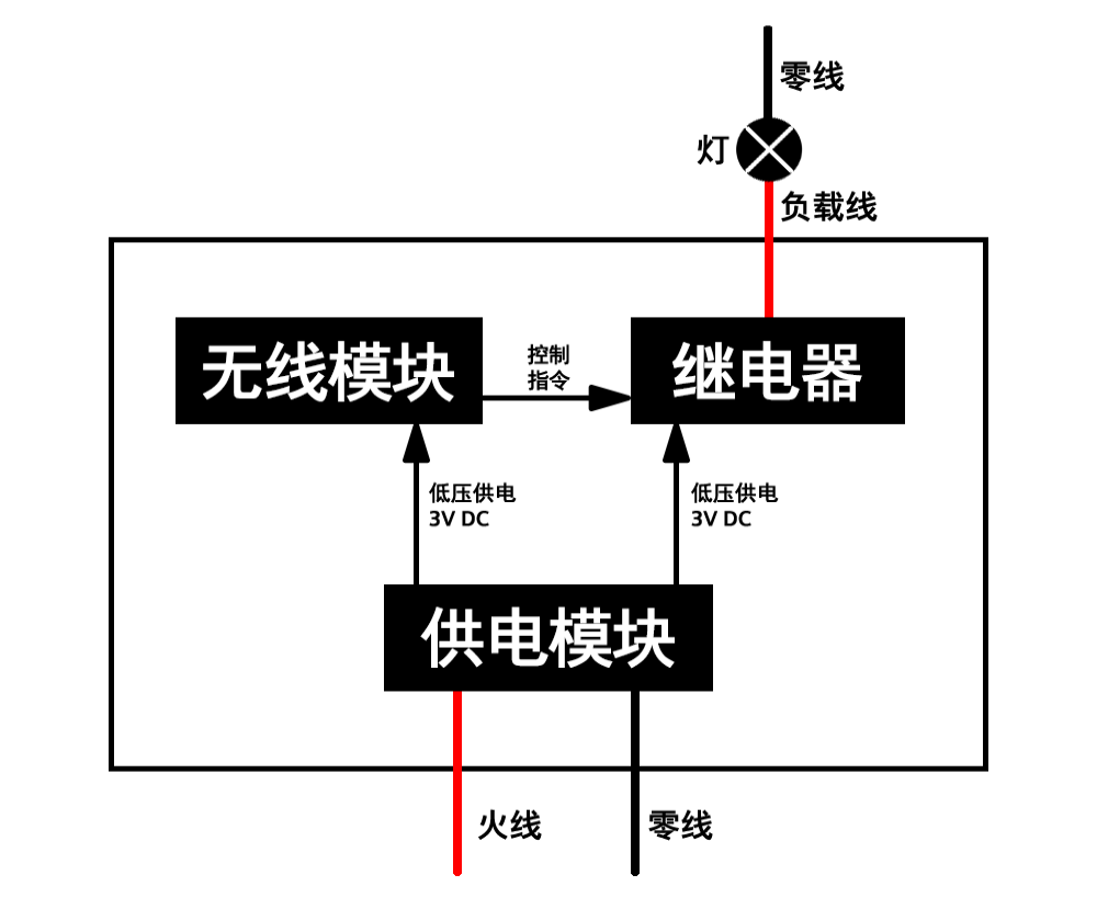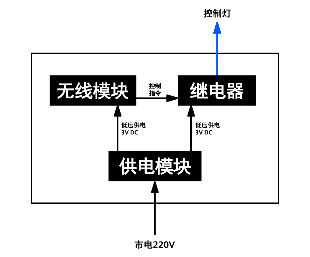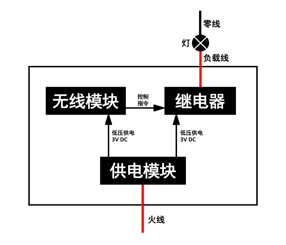 其核心組成部分為供電模塊、無線模塊和繼電器,無線模塊接收遙控器、手機APP、智能音箱等發出的指令,并將控制指令傳輸給繼電器,執行開和關的操作。