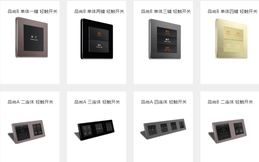 多種選擇,靈活搭配,除了觸摸按鍵外,還有功能豐富的各類型插座,如耳機插座、電腦插座、電視插座、五孔USB插座、五孔插座、剃須刀插座、調音開關、調光開關,以及各種組合開關等。