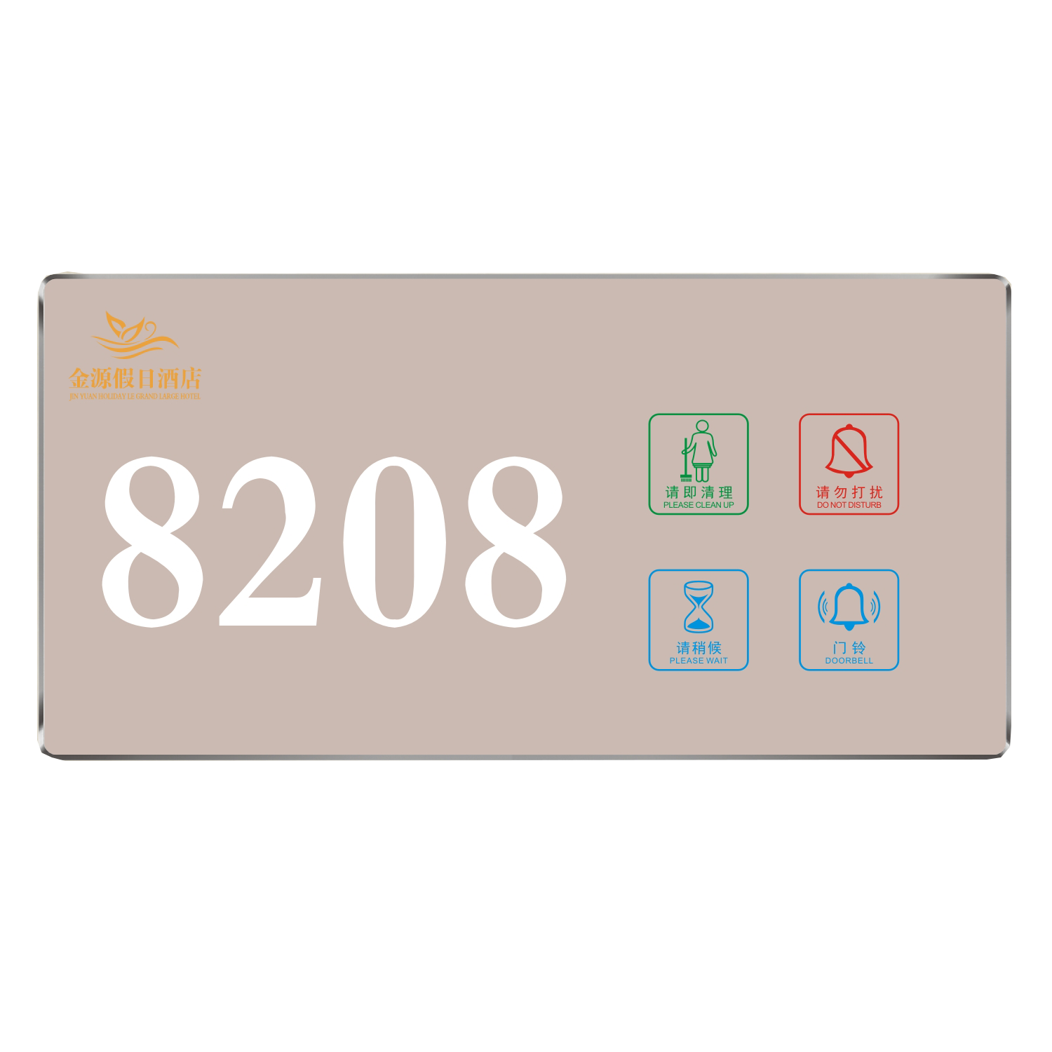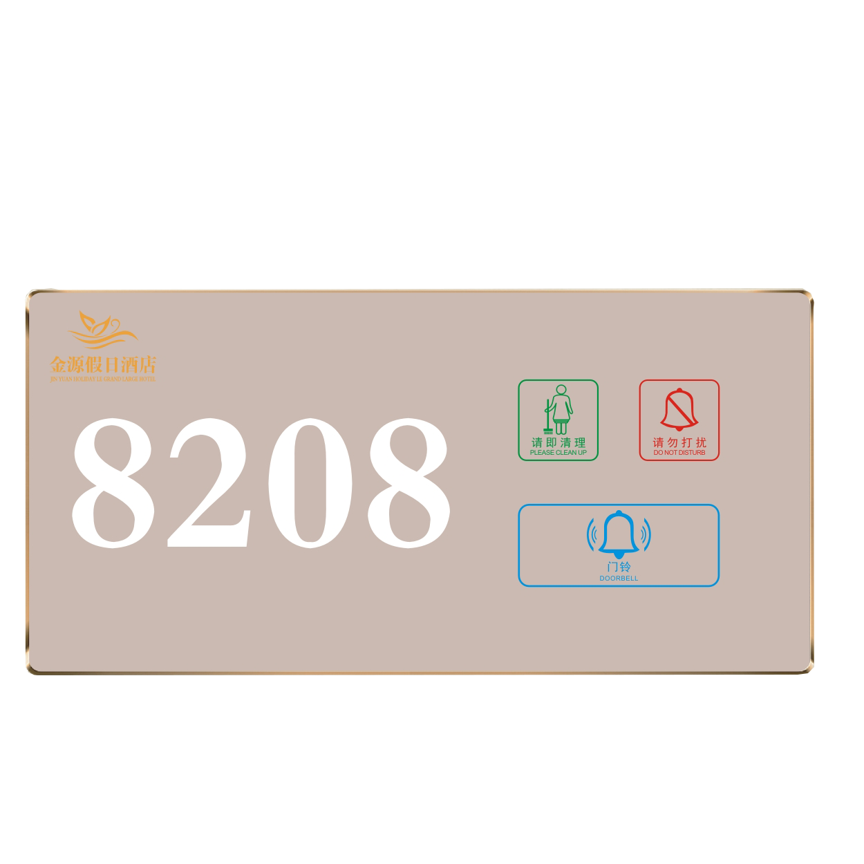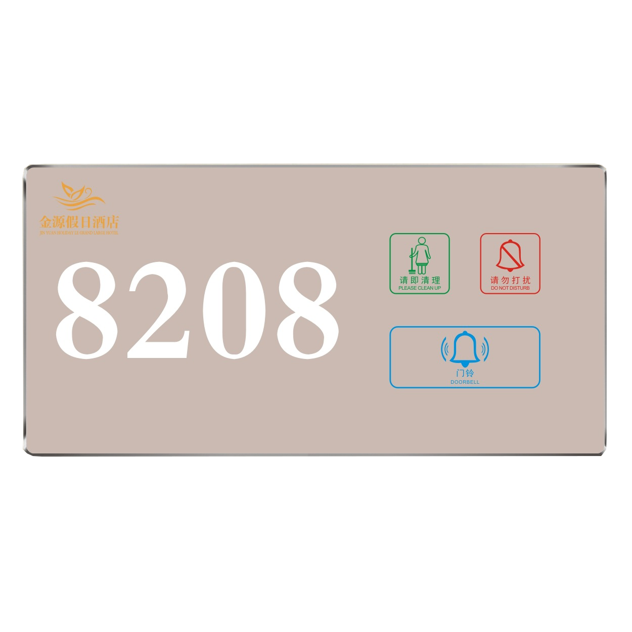 2、客人按下房間內的"請勿打擾”開關,液晶屏的"請勿打擾”圖案背光亮起,門外顯示屏中提示請不要打擾,此時門鈴按鍵不起作用。