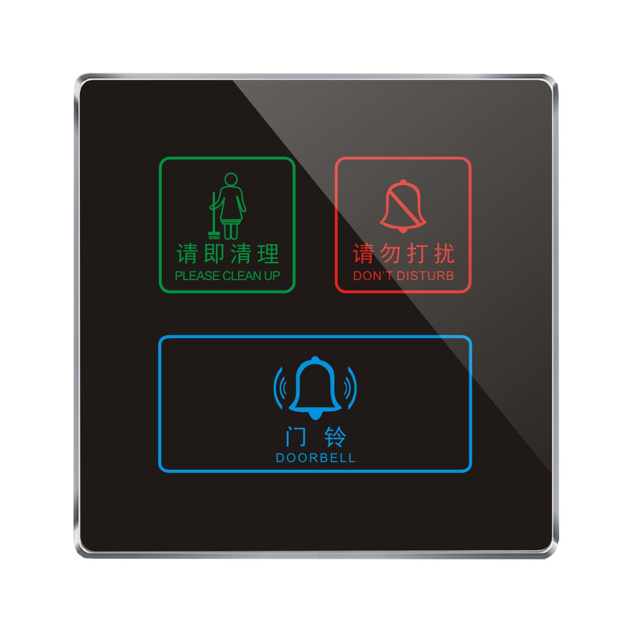 2、客人按下房間內(nèi)的"請(qǐng)勿打擾”開關(guān),液晶屏的"請(qǐng)勿打擾”圖案背光亮起,門外顯示屏中提示請(qǐng)不要打擾,此時(shí)門鈴按鍵不起作用。