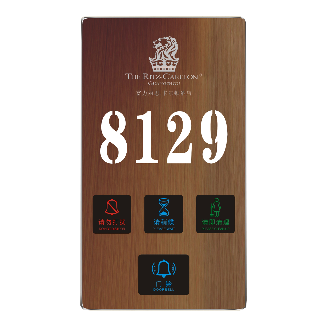 2、客人按下房間內的"請勿打擾”開關,液晶屏的"請勿打擾”圖案背光亮起,門外顯示屏中提示請不要打擾,此時門鈴按鍵不起作用。